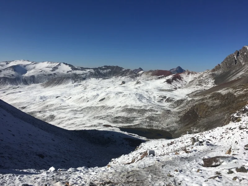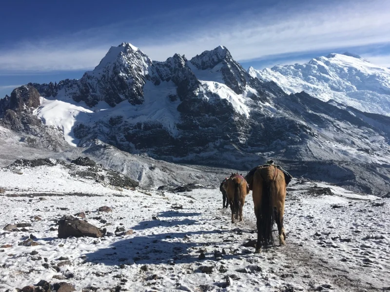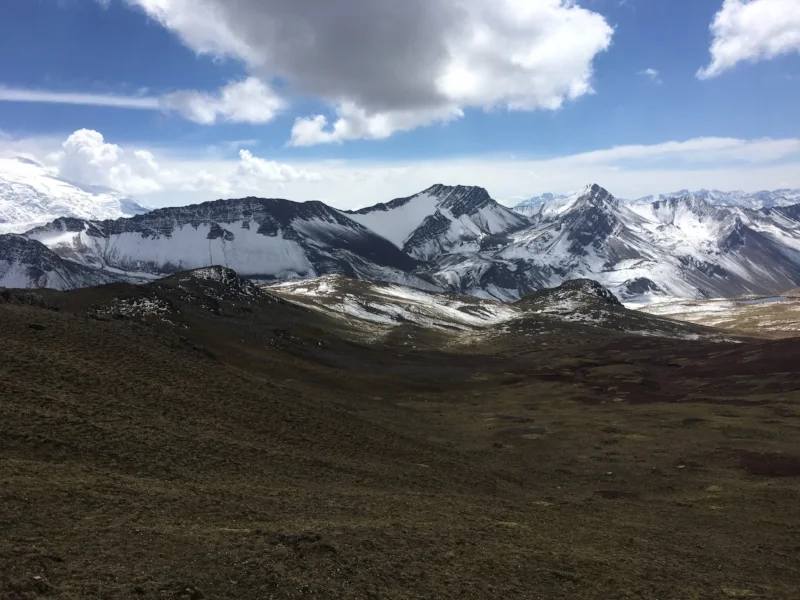 Immediately upon leaving camp we were climbing our way over the next mountain pass. Camp was at 15,320 ft., Pasa Surini was at 16,370 ft., which made for a good morning workout. Snow still covered the ground, leaving the mountainsides glistening and our feet slipping. We left camp around 5:30am and reached the top of the pass around 6:45am. The views from both directions were stunning.